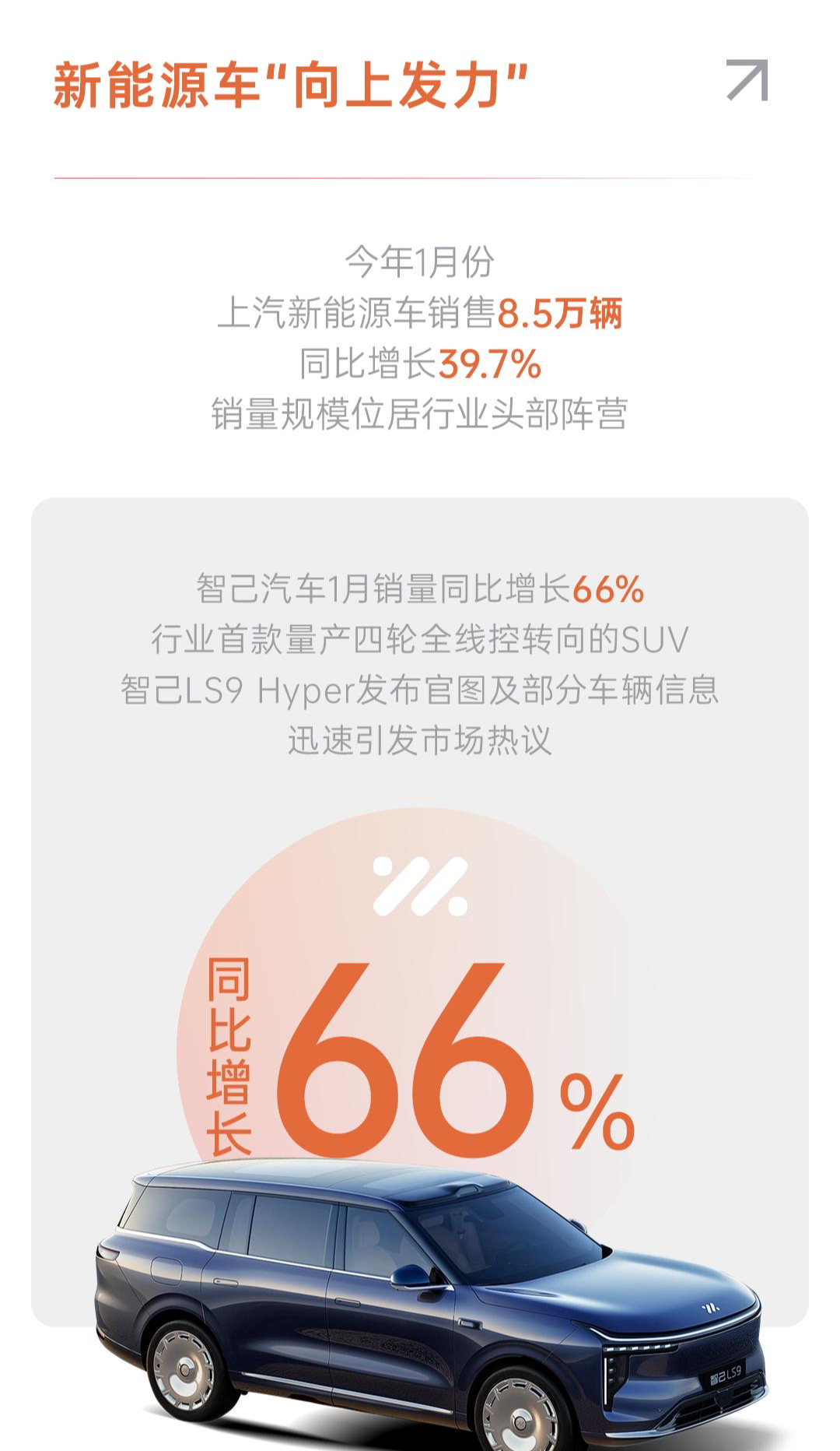 新能源车“向上发力”。今年1月份,上汽新能源车销售8.5万辆,同比增长39.7%,销量规模位居行业头部阵营。其中,智己汽车1月销量同比增长66%,行业首款量产四轮全线控转向的SUV——智己LS9 Hyper发布官图及部分车辆信息,迅速引发市场热议;上汽乘用车销售新能源车2.8万辆,同比增长576.9%;上汽大通销售新能源车0.4万辆,同比增长24.6%;上汽通用销售新能源车0.6万辆,同比增长316.1%;上汽通用五菱销售新能源车3.6万辆,新上市的“全能硬派大空间SUV”星光560订单火爆。
