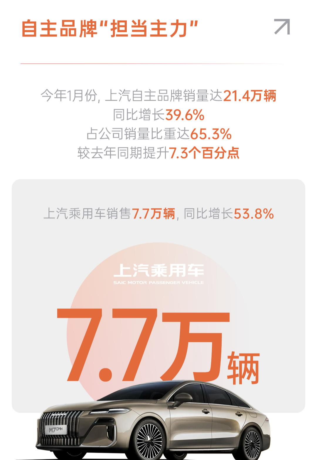 自主品牌“担当主力”。今年1月份,上汽自主品牌销量达21.4万辆,同比增长39.6%,占公司销量比重达65.3%,较去年同期提升7.3个百分点。其中,上汽乘用车销售7.7万辆,同比增长53.8%;上汽大通销售1.8万辆,同比增长18.2%;上汽通用五菱销售10.5万辆,同比增长37%。