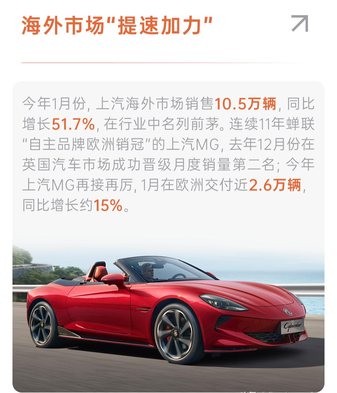 海外市场“提速加力”。今年1月份,上汽海外市场销售10.5万辆,同比增长51.7%,在行业中名列前茅。连续11年蝉联“自主品牌欧洲销冠”的上汽MG,去年12月份在英国汽车市场成功晋级月度销量第二名,力压福特、现代、丰田等全球主流品牌;今年上汽MG再接再厉,1月在欧洲交付近2.6万辆,同比增长约15%。