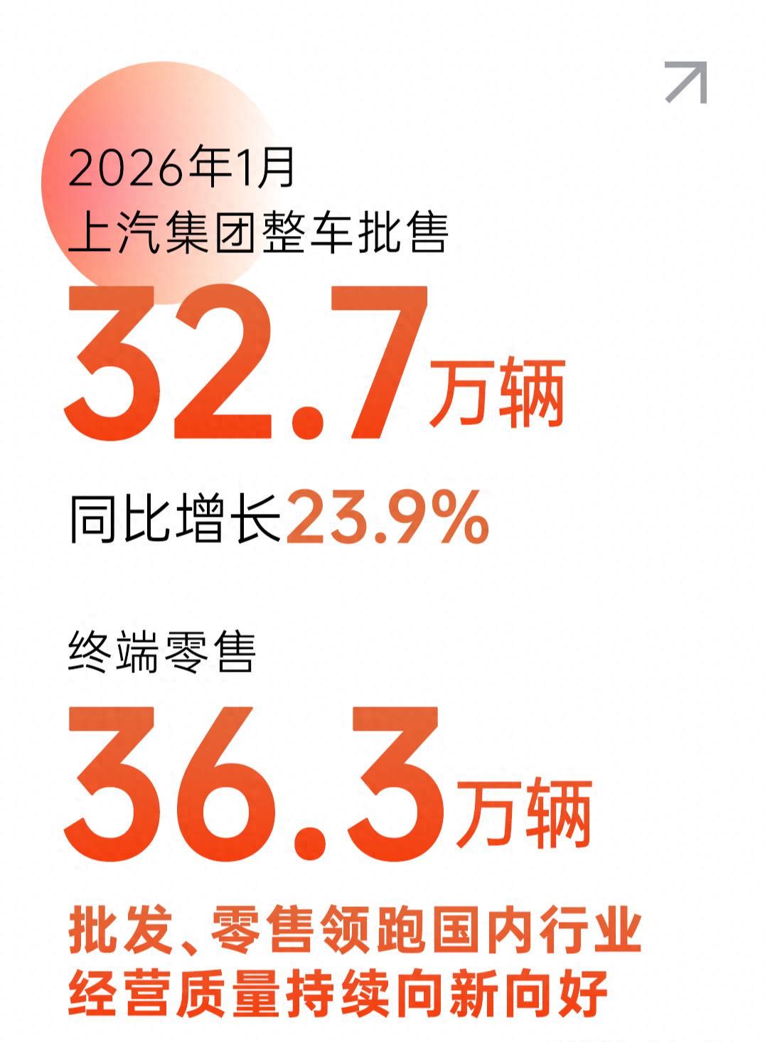 2026年2月2日,上汽集团发布1月销量数据,继去年全年整车销量实现同比两位数增长后,2026年上汽集团再迎市场开门红:1月实现整车批售32.7万辆,同比增长23.9%,终端零售36.3万辆,批发、零售销量规模双双领跑国内汽车行业,经营质量持续向新向好。其中,上汽自主品牌销售21.4万辆,同比增长39.6%;新能源车销售8.5万辆,同比增长39.7%;海外市场销售10.5万辆,同比增长51.7%。