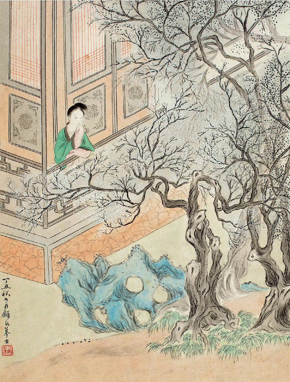 布景更是"惜墨如金"。"梅边伤春"里,梅枝从画面右上角斜出,只画三两根,却枝枝带劲,花苞用胭脂轻点,像刚着了春寒的红。仕女站在梅下,大半身子藏在阴影里,只露半张脸,可那声"春愁",早顺着梅香飘了出来。这种"人景相衬"的巧,是顾洛的独门功夫:景不用多,能托出人的心事就够;笔不用繁,能勾出态的魂就妙。