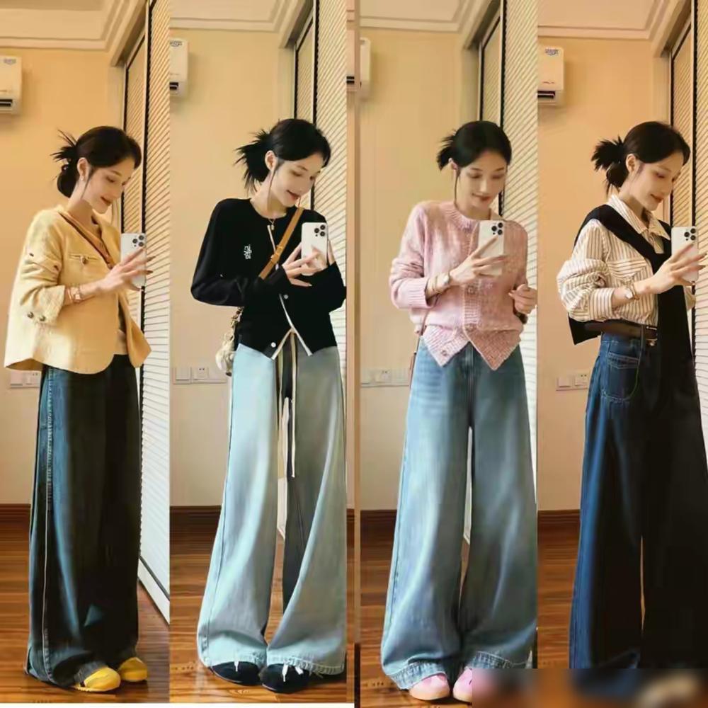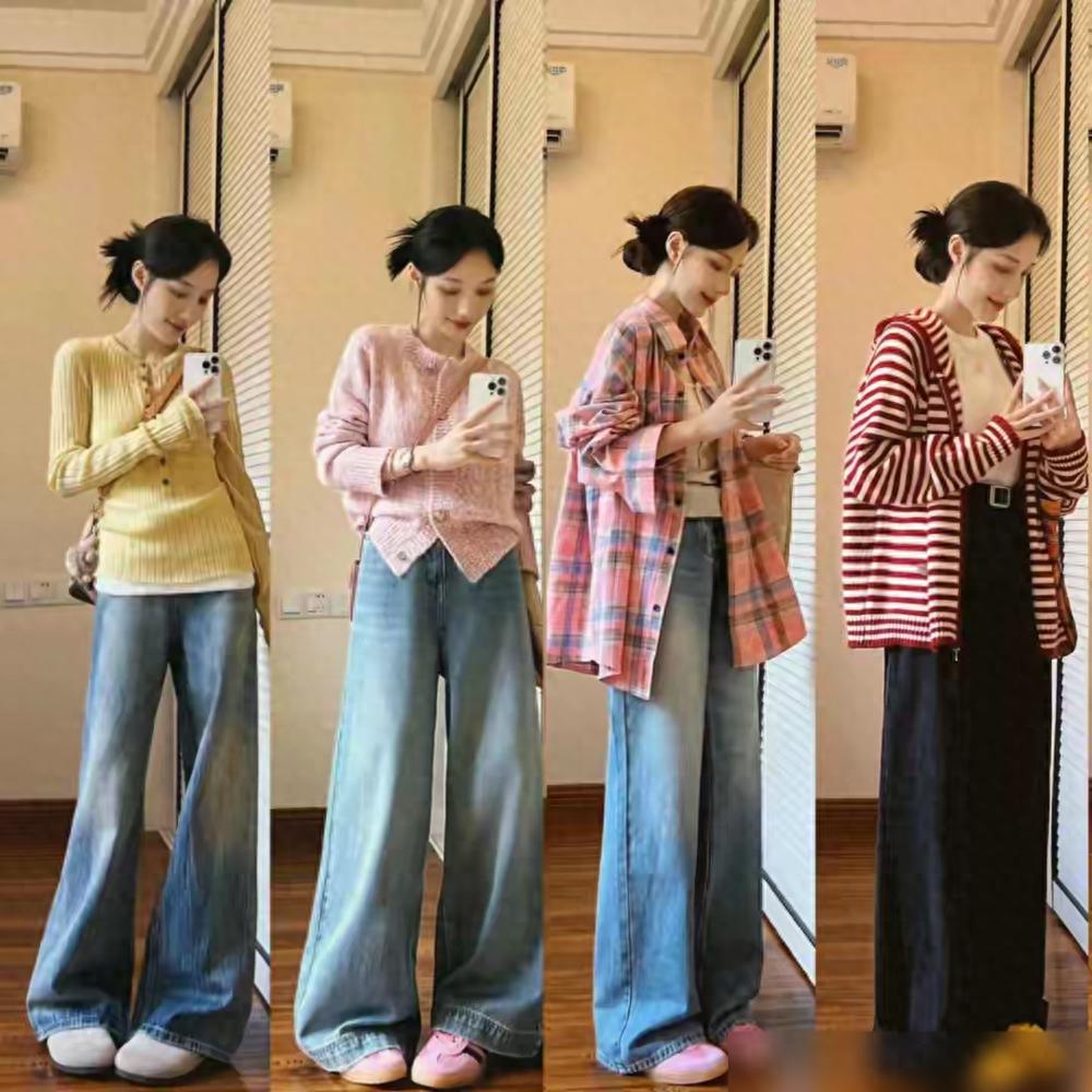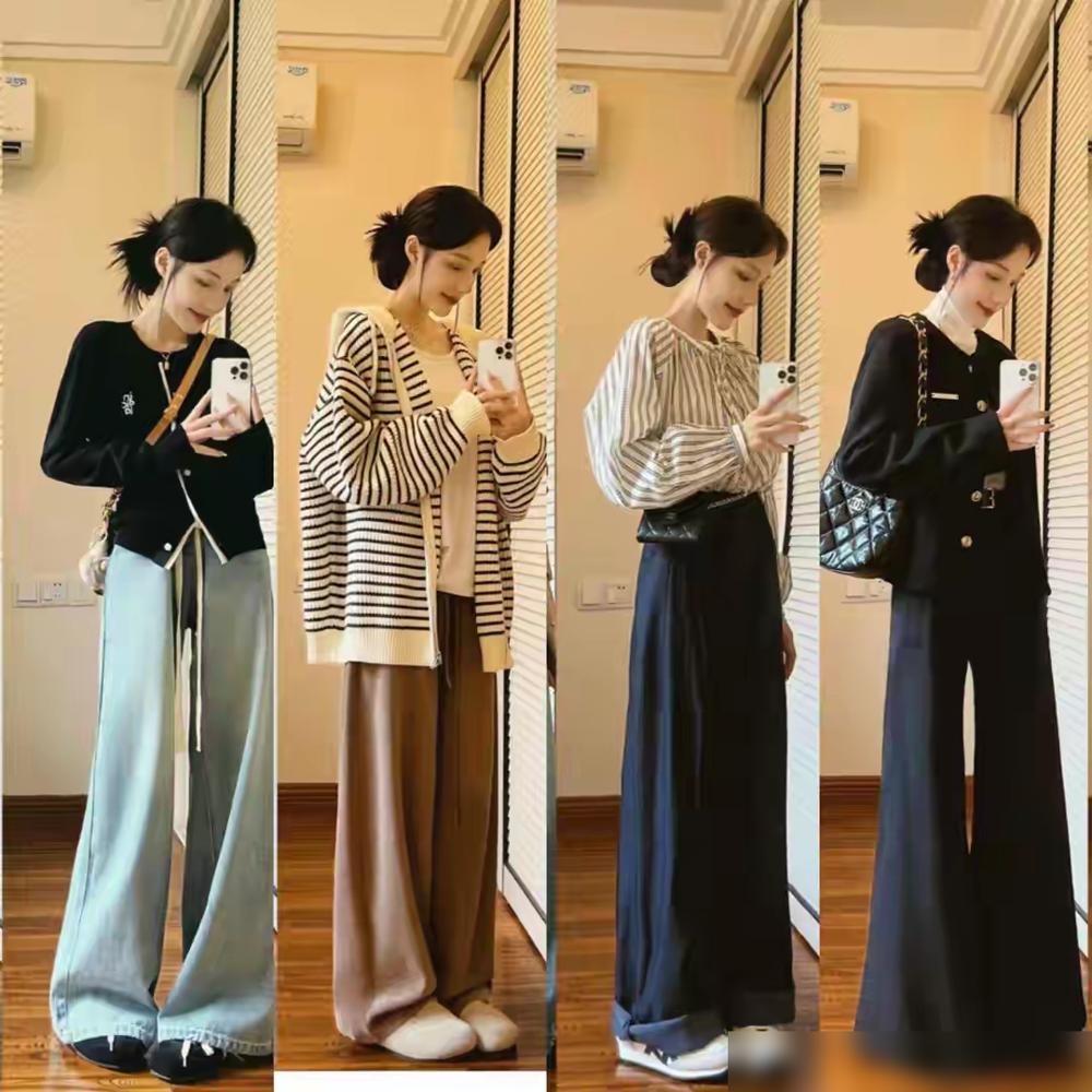 阔腿裤选垂感好的很重要。西装面料或者挺括的牛仔都不错,长度最好盖住脚面。这样显腿长,还能遮住肉肉。