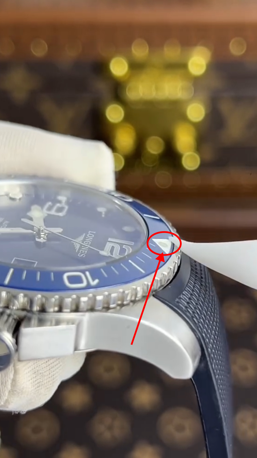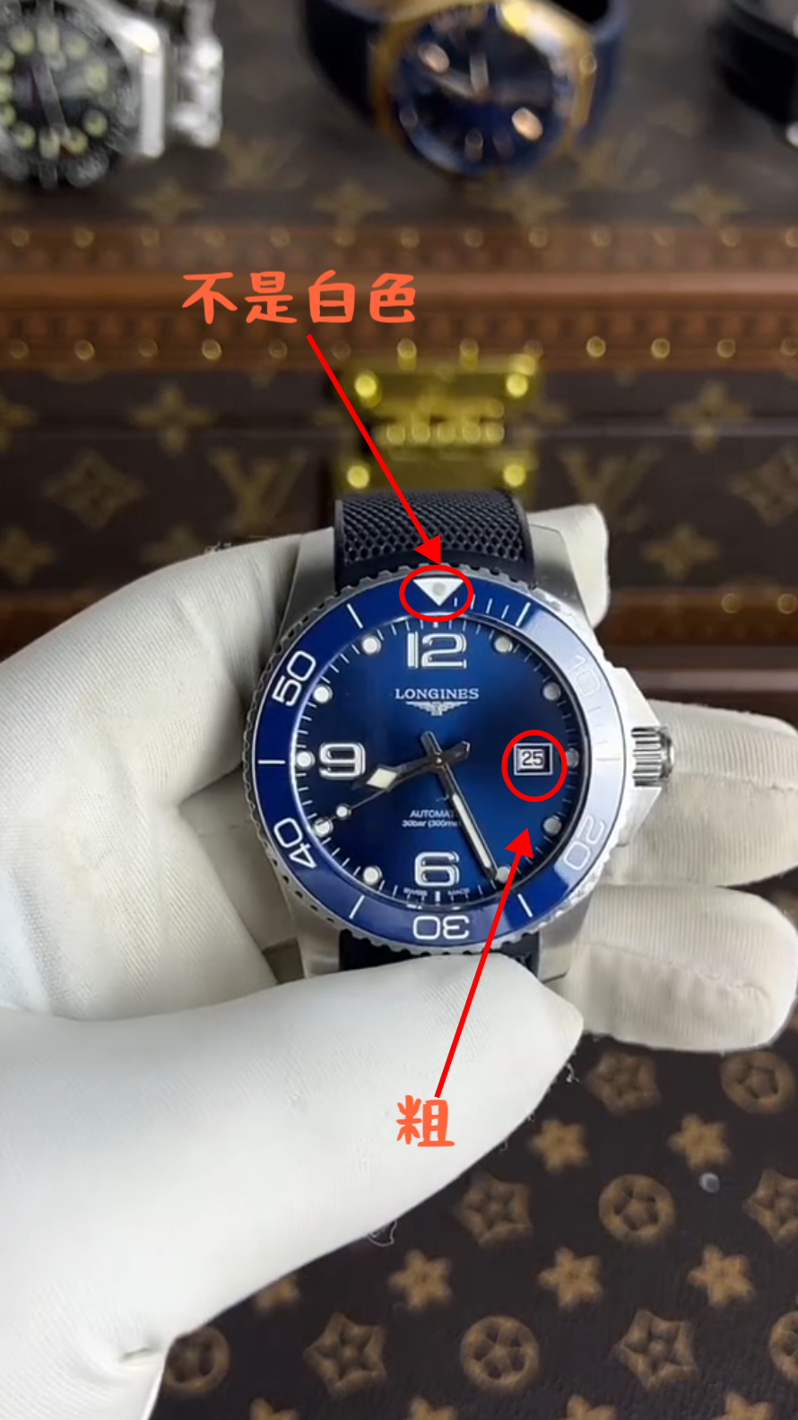 它的日历一定是字体比较粗的,第二点就是这个夜明珠,它的夜明珠不是白色的,一定是跟玉一样,有点那种温润如玉的那种感觉,不是死白色的,另外我们从侧面看的话AF康卡斯,他的夜明珠一定是平平的,不会凸出来