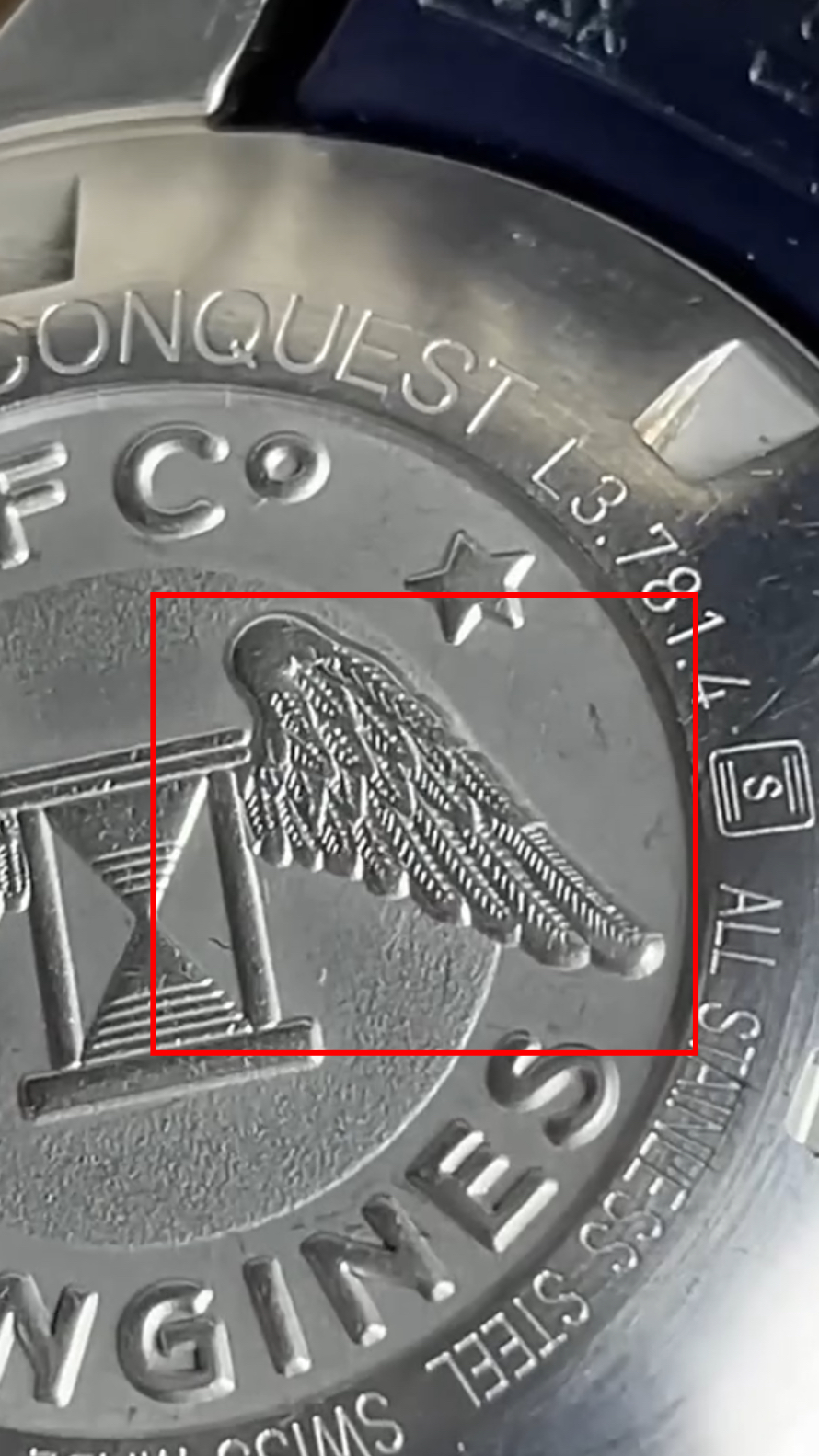 最后一点,我们要看后盖的这个刻字是非常立体的,整个local非常立体,包括这,特别是这个翅膀啊,每一根翅膀都是清晰可见的