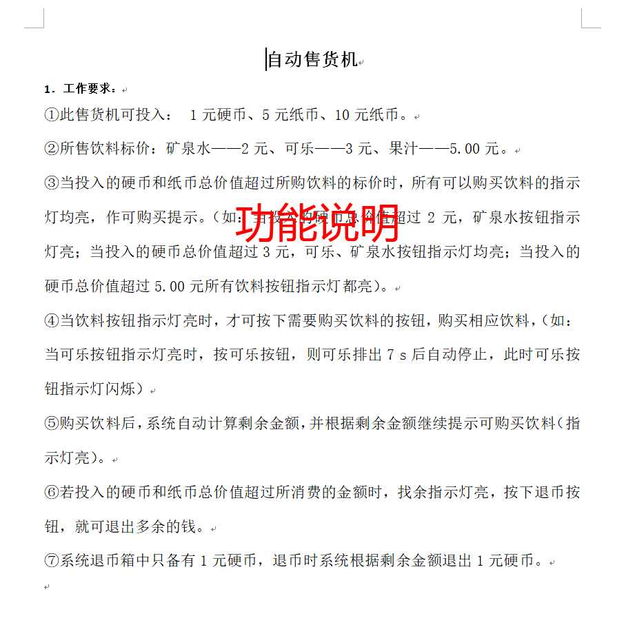 实践意义:开发具备投币识别、商品选择、自动出货、找零等完整功能的自动售货机控制系统,可直接应用于小型零售场景,提升零售效率与用户体验。