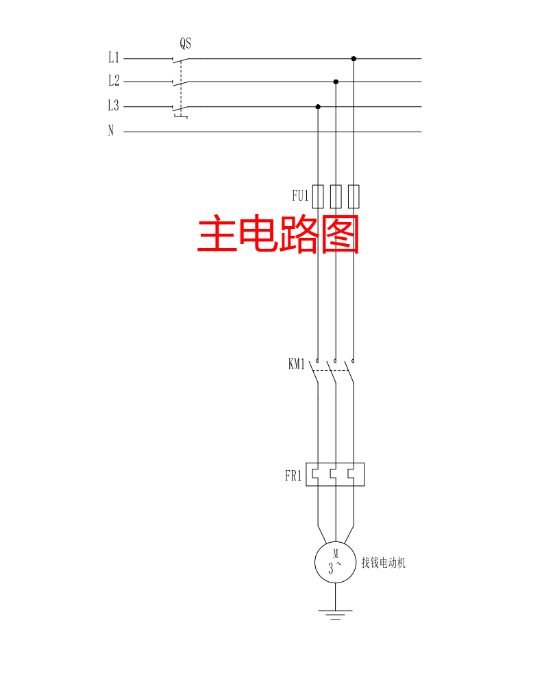 绘制主电路原理图,包括三相电源输入、断路器(QS)、熔断器(FU1)、接触器(KM1)、热继电器(FR1)、找钱电动机(M)的连接关系,说明电路保护原理(过载保护、短路保护)。