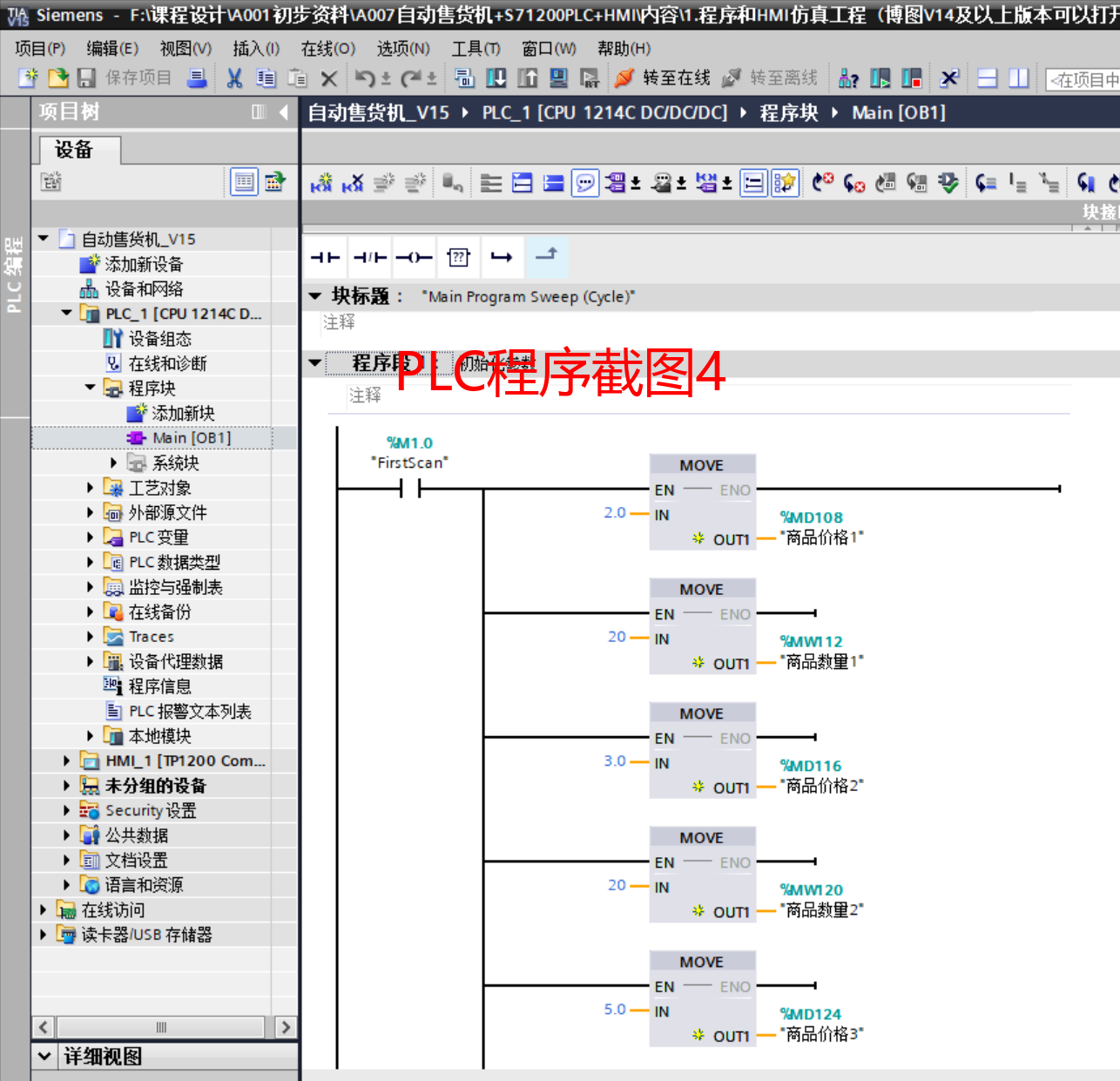 编程实现:通过MOVE指令将初始值写入对应数据存储地址,触发条件为%M1.0(FirstScan)。