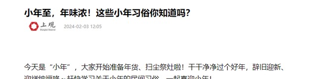 【3】上观新闻,2024-02-03,“小年至,年味浓!这些小年习俗你知道吗?”.