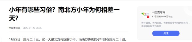 【2】中国青年网,2025-01-22,“小年有哪些习俗?南北方小年为何相差一天?”.
