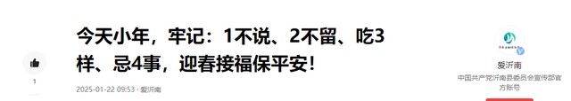 【1】爱沂南,2025-01-22,“今天小年,牢记:1不说、2不留、吃3样、忌4事,迎春接福保平安!”.
