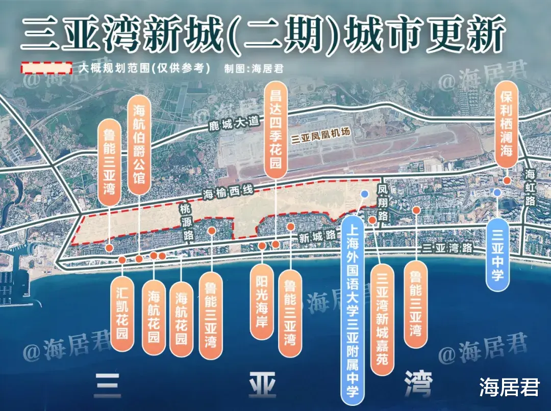 如今,三亚湾新城城市更新二期曝光,位于一期的北侧,东至凤翔路、西至御海路、南至桃源河、北至海榆西线,用地面积122.11公顷(1831.59亩)。