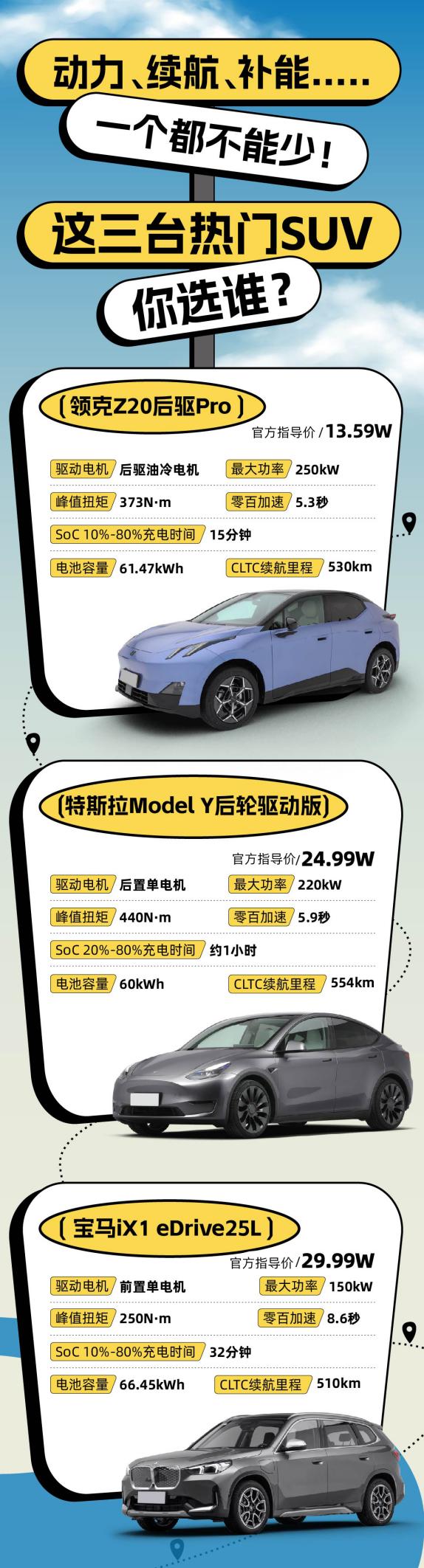 从价格来看,领克Z20、Model Y和宝马iX1分别以13.59万起、24.99万起和29.99万起的价格,覆盖了15-30万这一主流价格区间。这使得这三款车在预算选择上拥有很大的灵活性。