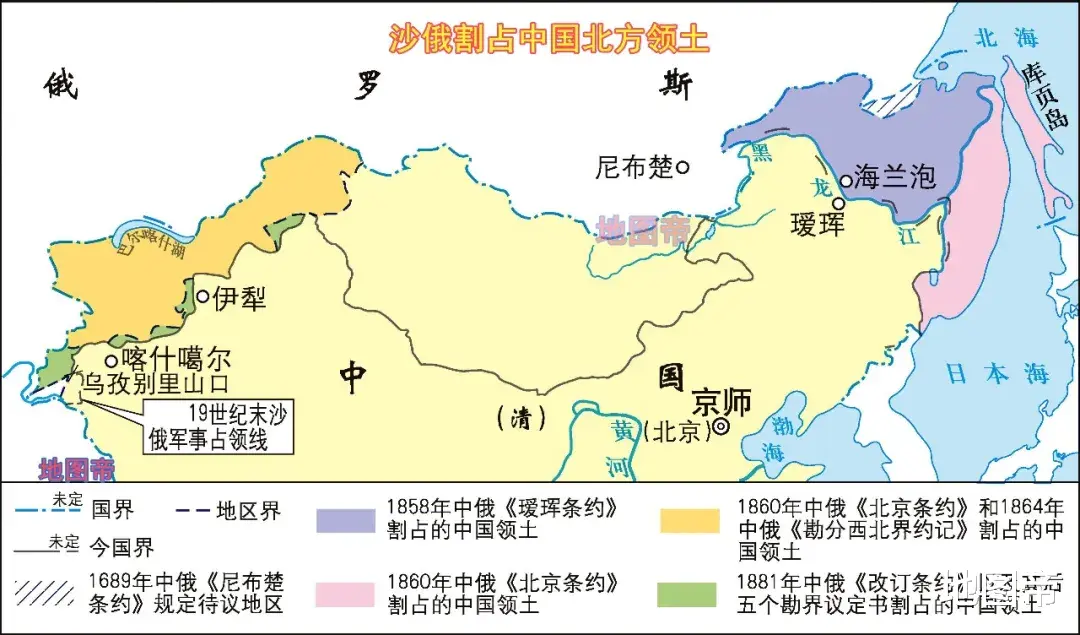 1860年(清文宗咸丰十年)11月14日,清朝与俄国签订《中俄北京条约》,签订地在北京,清朝代表为恭亲王奕䜣(道光帝第六子)。条约规定:清朝割让今黑龙江省乌苏里江以东(包括库页岛)约40万平方千米的领土,也失去了海参崴。