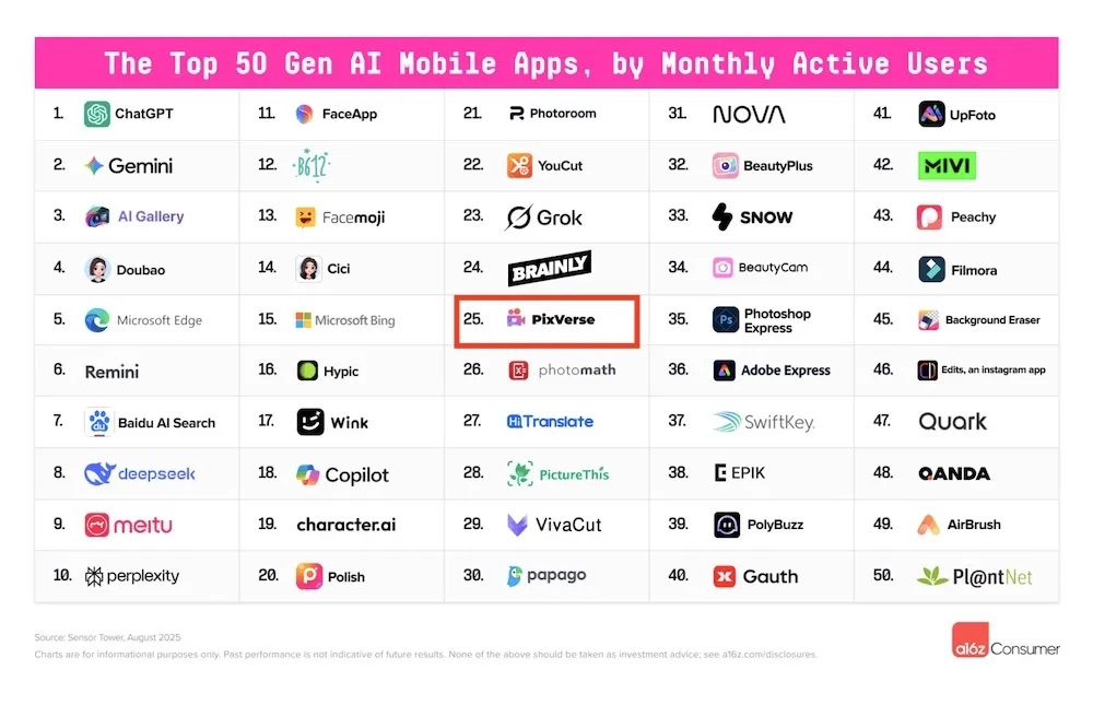 全球Top 50生成式AI消费移动应用(图源:a16z)