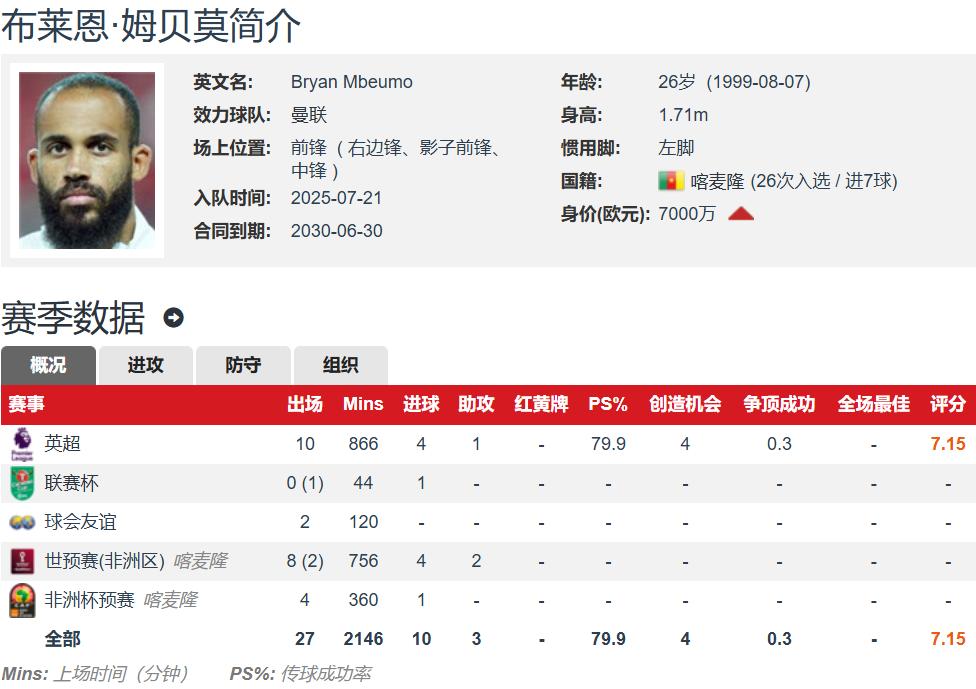 姆伯莫本赛季10场英超4球1助,参与进球基本上都来自10月份,就占据了80%。随着姆伯莫融入球队,曼联的战力会持续提升。姆伯莫加盟曼联之后,身价已经涨至7000万欧元。
