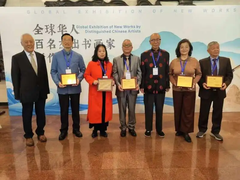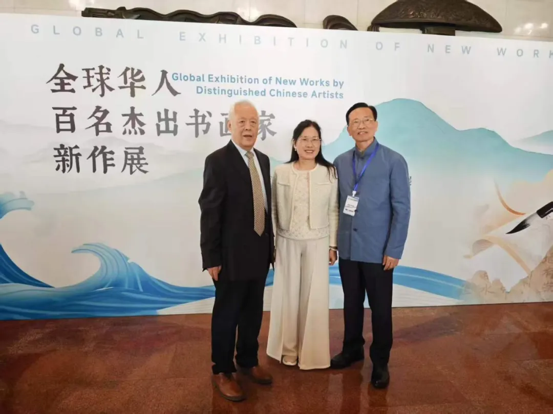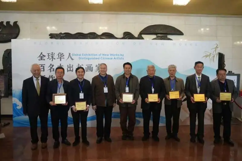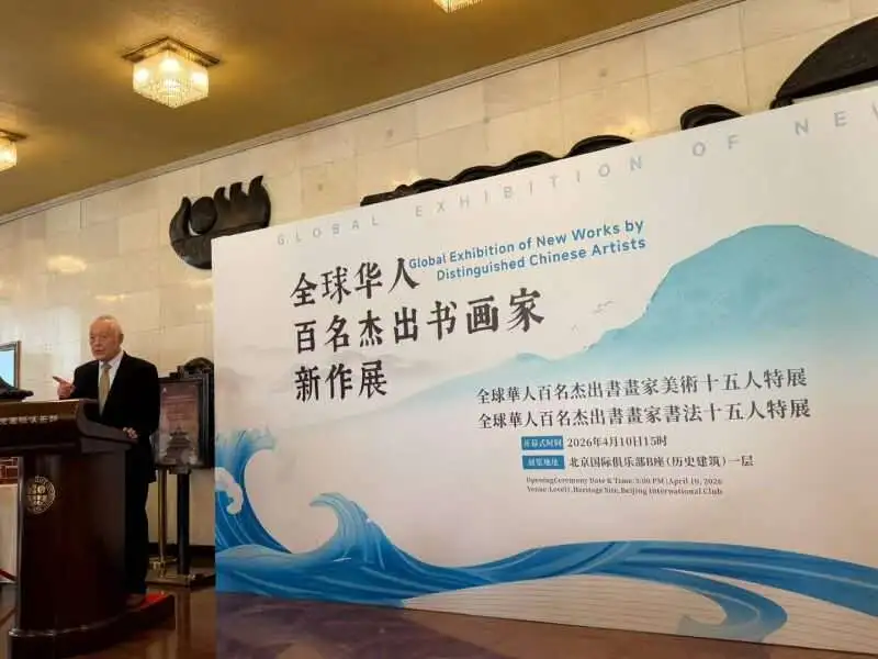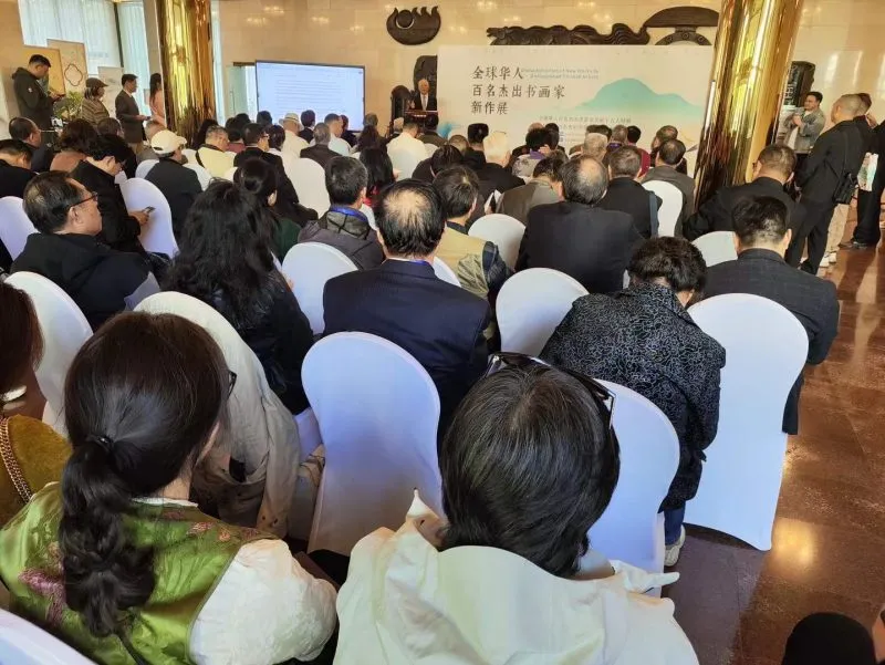 4月10日,全球华人百名杰出书画家新作展在北京国际部俱乐部展厅举行。曾经接待过许多国际政要和知名人士的北京国际俱乐部宽敞的大厅内,竖立着全球华人百名杰出书画家新作展的大背景版。大屏幕上播放着专为此次展览制作的电视片《墨润五洲一全球华人百名杰出书画家新作展》。