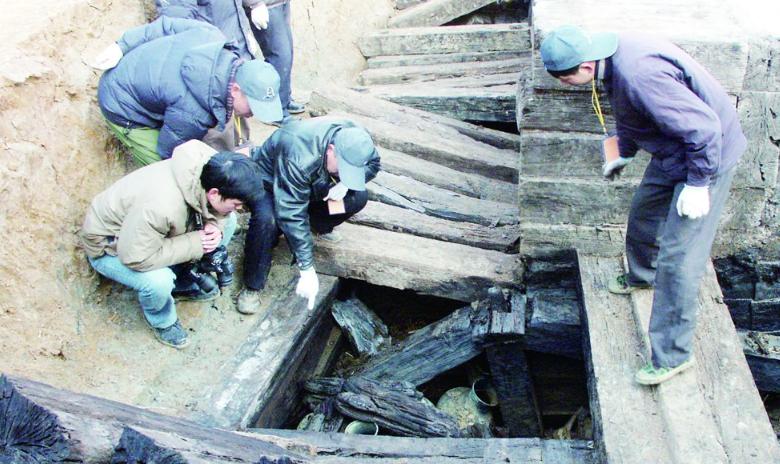 但眼前这座墓葬有点特别。墓中用的不是传统的黄心柏木,而是就地取材的大别山区栎木。近千根栎木整齐码放,层层叠垒成11层的木墙,南、西、北三面是“题凑”,东面是门,正对墓道,形成了一座长9.1米、宽7米、净空2.5米的木构空间。题凑之内,墓室也结构极为讲究,最外层是四层盖板,里面是木椁、石椁及两层木质重棺。
