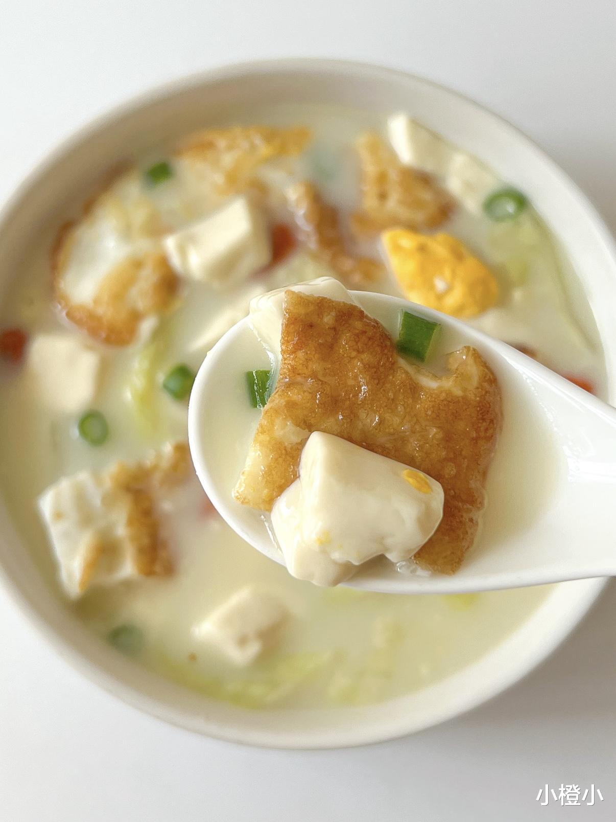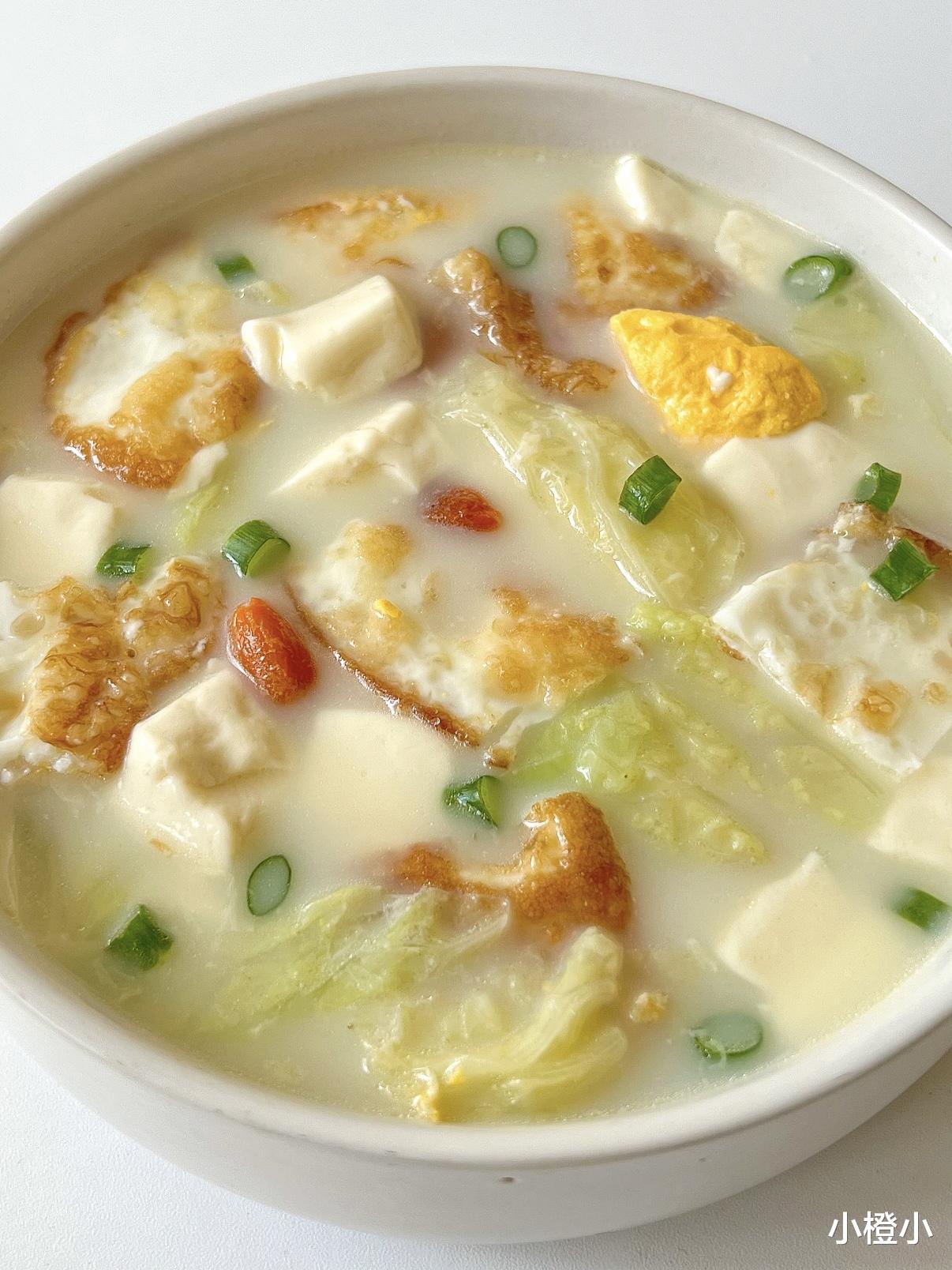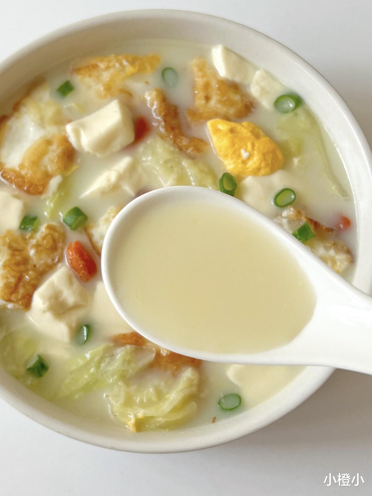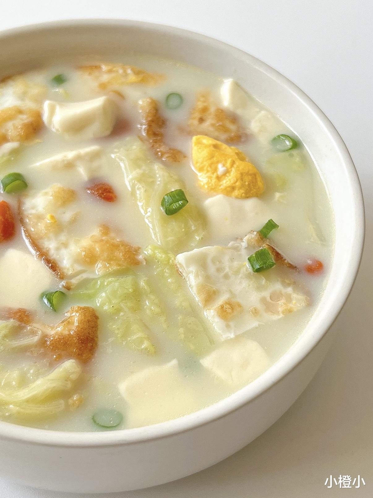 这碗白菜煎蛋豆腐汤,把“平凡”二字写成了诗:白菜是衣柜里那件百搭白T,豆腐是软糯小抱枕,煎蛋是太阳,汤汁是冬日棉被。十分钟,一口奶白,一口清甜,疲惫值瞬间清零。周末睡到自然醒,阳光照进厨房,锅里咕嘟咕嘟,你捧着碗吹气,这就是生活偷偷给你的糖。快去冰箱翻白菜,今晚的“白月光”等你签收!