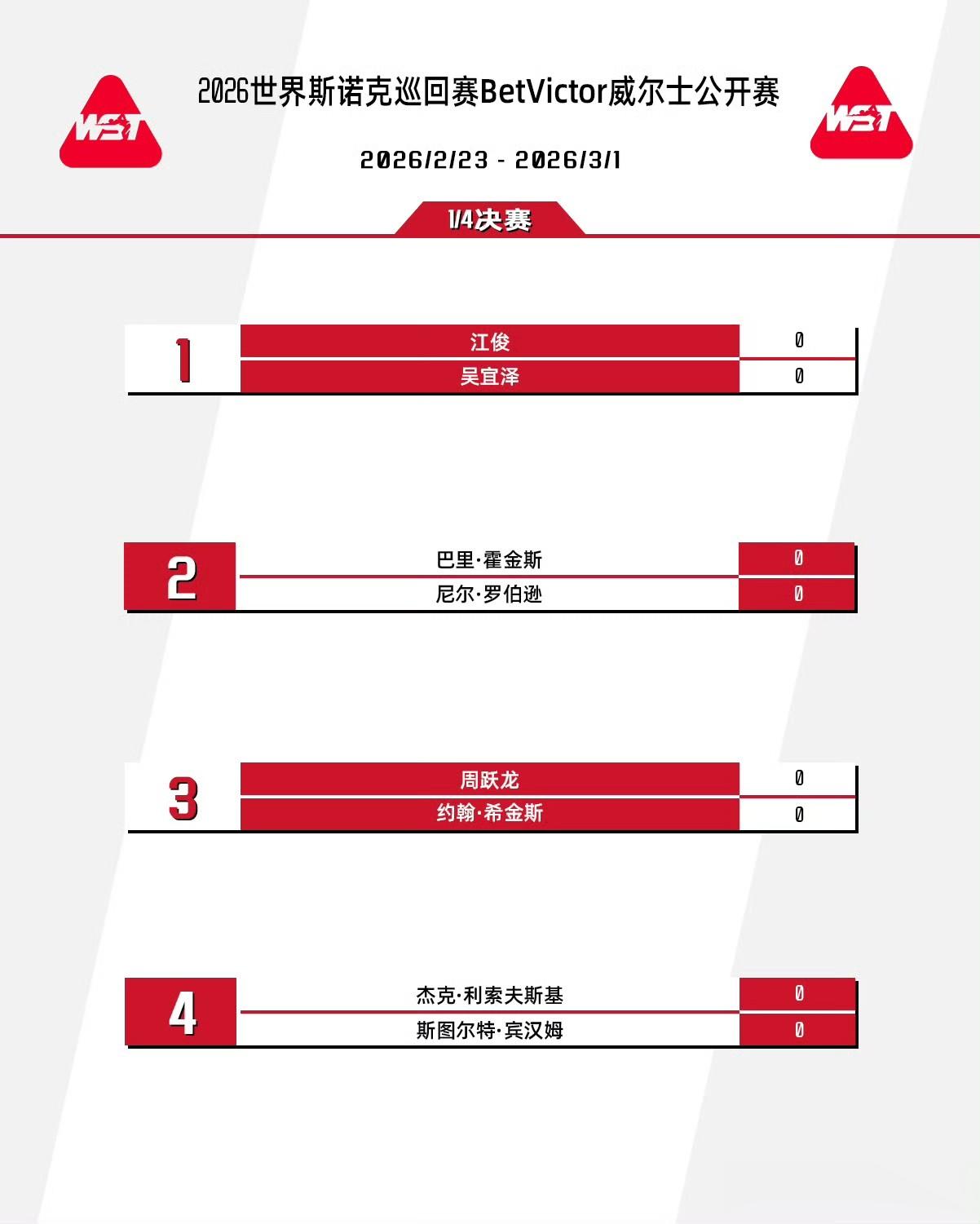 北京时间2026年2月27日,2026斯诺克威尔士公开赛四分之一决赛将继续进行,在昨日晚间和今天凌晨结束的16进8轮次的比赛中,中国选手5人出战最终3人顺利突围成功晋级8强,第4轮8进4轮次中国选手这边将有1场中国德比和一场外战,确保了至少1人能够尽快威尔士公开赛4强,8进4轮次具体赛程如下: