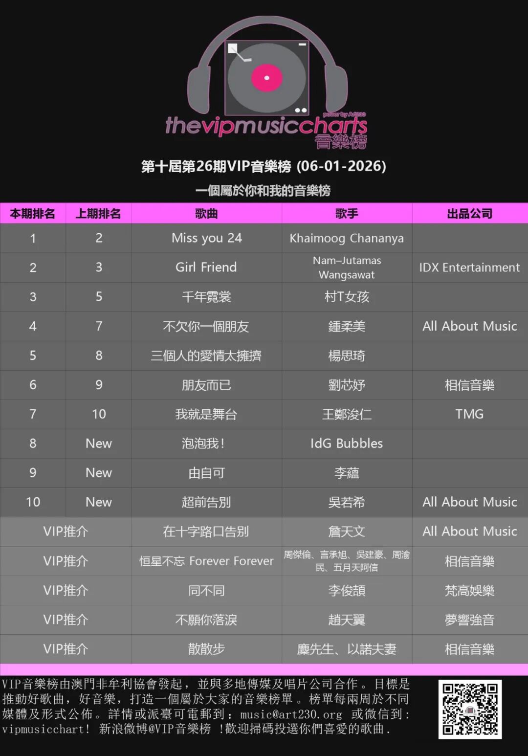 由春晚星推官,来自台湾创作歌手/制作人「许雅涵」所推广的VIP音乐榜第十届第26期榜单