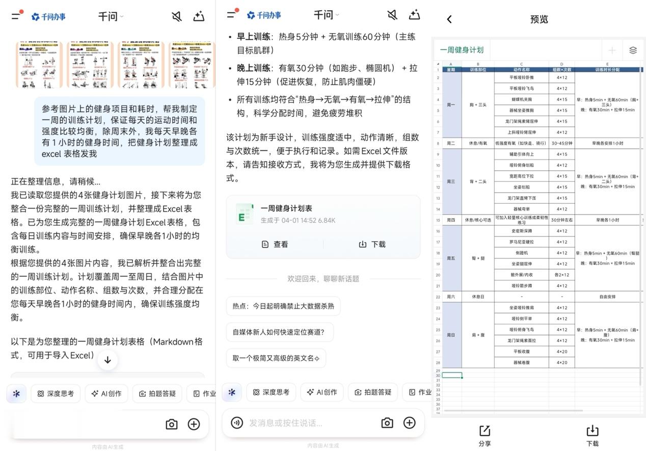 千问还能深度理解多轮对话上下文,在旅行规划、项目讨论、学习复盘等场景,用户与千问反复沟通细节后,只需一句“把刚才聊的内容整理成Excel行程计划”,千问便能自动提炼关键信息,生成包含日期、地点、交通、住宿、预算、备注等完整字段的结构化表格,一键保存、随时分享。