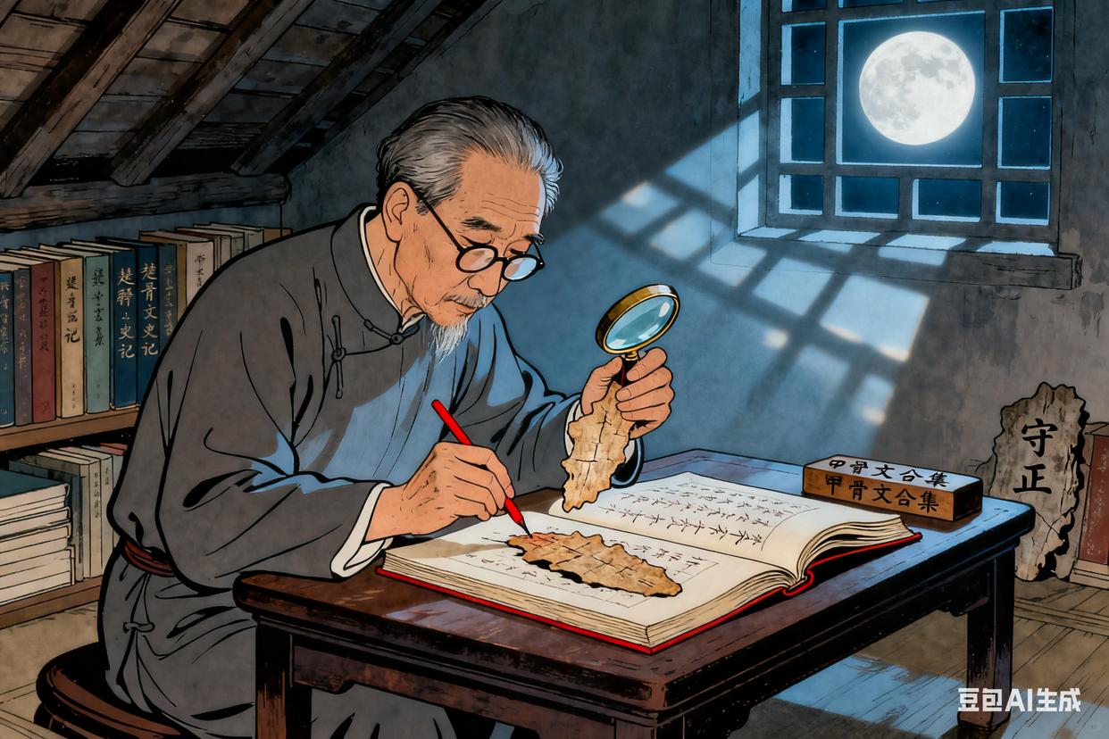 1927年“四一二”事变后,上海的空气里飘着血腥味。郭沫若躲在法租界的一间小阁楼里,桌上放着一本打开的《甲骨文合集》,旁边是半碗凉透的粥。有天夜里,郑振铎来看他,劝他“先避避风头,别再碰这些‘敏感’的东西”,他却指着甲骨上的刻痕说:“你看这字,是三千年前商王刻的,那时候的人也经历过战乱,也盼着太平。我从这些骨头里找的不是字,是咱们中国人的根——根还在,就不怕倒。”他用放大镜一点点看甲骨上的裂纹,手指轻轻蹭过那些古老的刻痕,像是在跟千年前的人对话。阁楼的窗户很小,月光照进来,在桌上投下一块方方正正的亮,他就借着这点光,把甲骨上的字一个个抄在本子上,本子的封皮上写着“守正”两个字,是他用毛笔写的,笔锋很劲。