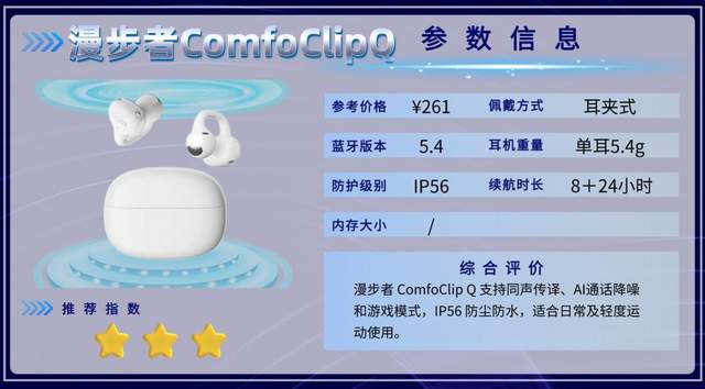 ComfoClip Q轻巧舒适、功能全面,支持同声传译、AI助手、双设备连接和入耳检测,日常办公、轻运动或短途出行都能使用。音质和运动佩戴都中规中矩,不适合高强度运动或专业音乐体验,但续航单次8小时、配合充电盒总续航32小时,能满足大多数日常需求,属于稳妥实用型选择。