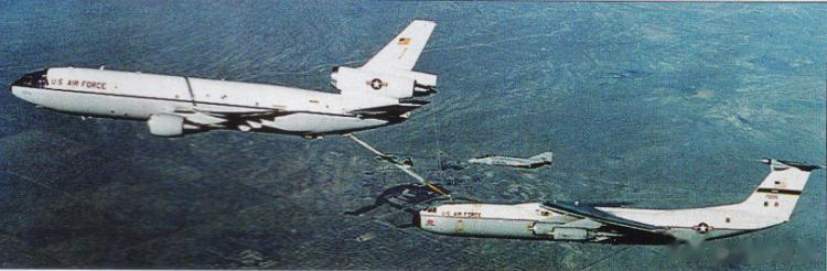 图示:KC-10为C-5进行加油,实际上二者之间的空气涡流对驾驶员是一个严酷的考验。远处的KC-135是作为KC-10的备份,保证能够加满C-5总容量达150吨的油箱。