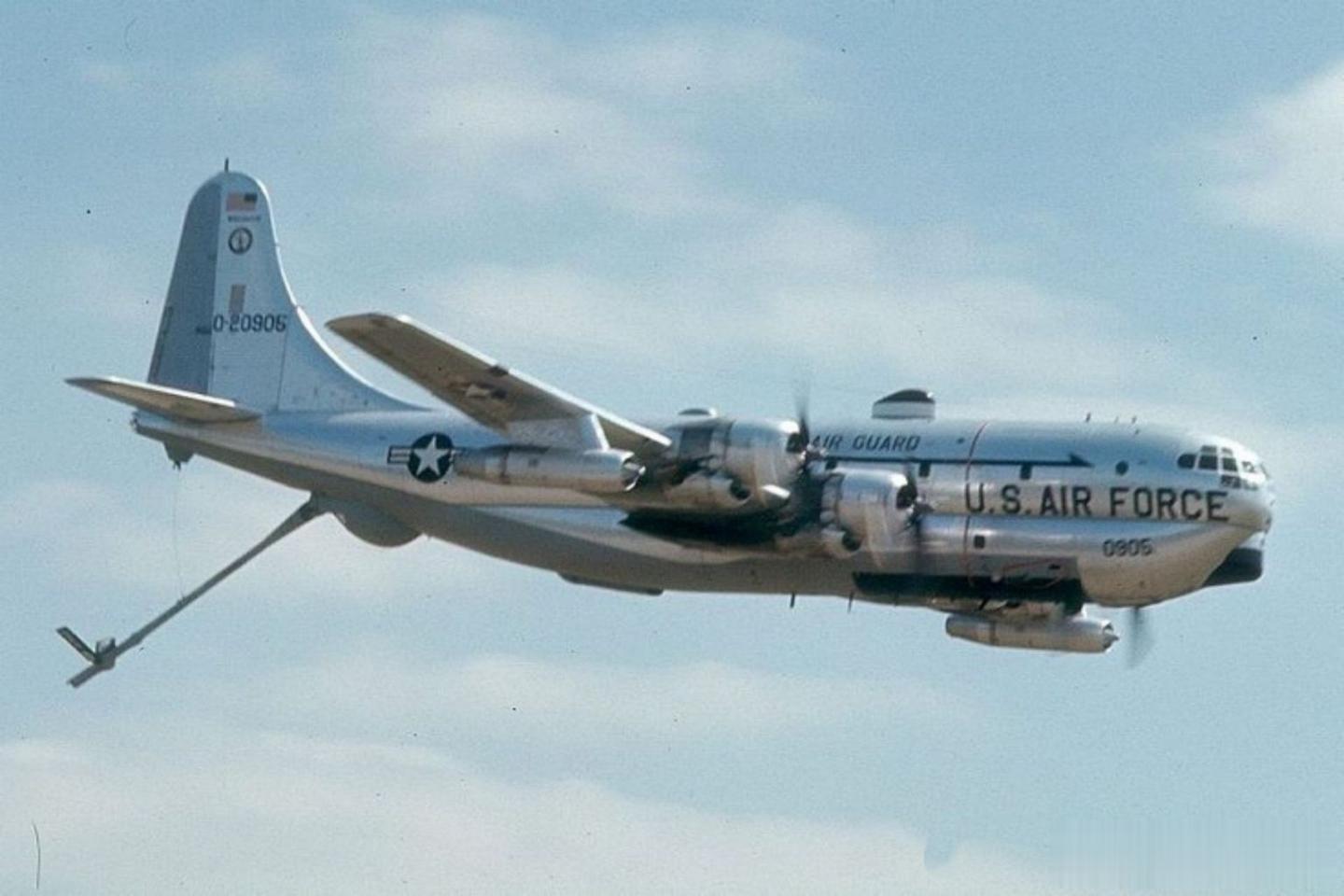 图示:二战后,美国对B-29轰炸机在使用原有设计的基础之上,换成了直径更大的机身,修改成了C-97运输机,由于C-97具有较大的空间可以安装大量的燃料箱,所以这款运输机被战略空军司令部作为空中加油机使用,获得了巨大的成功,被叫做KC-97同温层空中加油机!