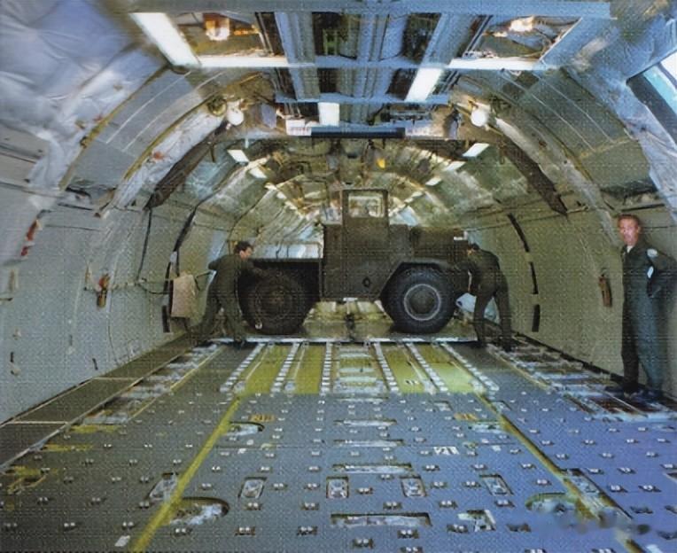 一辆工程车被固定在KC-10的货仓中,地板上保留了货柜固定设备。