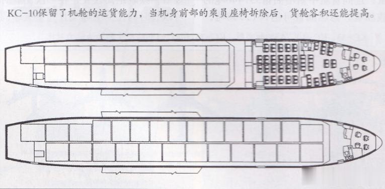 KC-10保留了机舱的运货能力,当机身前部的乘员座椅拆除后,货舱容积还能提高。