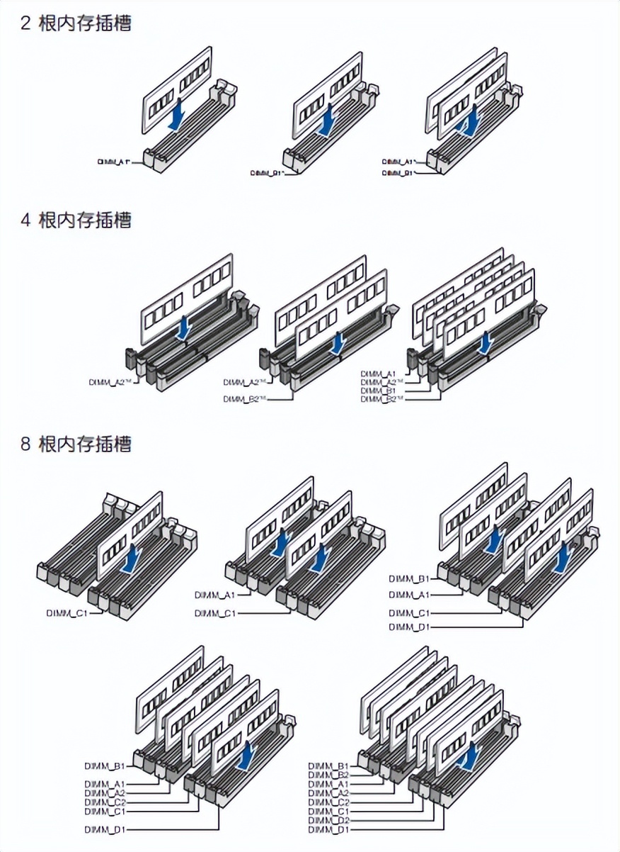 我描述里的插槽标号,是从靠近CPU的一侧开始数,第一,第二,第三,第四…图片里是用A1,A2,B1,B2…这样的编码表示的,大家插的时候注意对应关系就行。