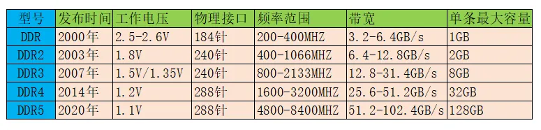 我整理了一个表格,通过这个表格,我们可以清楚地看出,内存的工作电压越来越低,也就是功耗和发热越来越小了。频率越来越高,带宽越来越大,单条容量越来越大,也就是性能越来越强了。