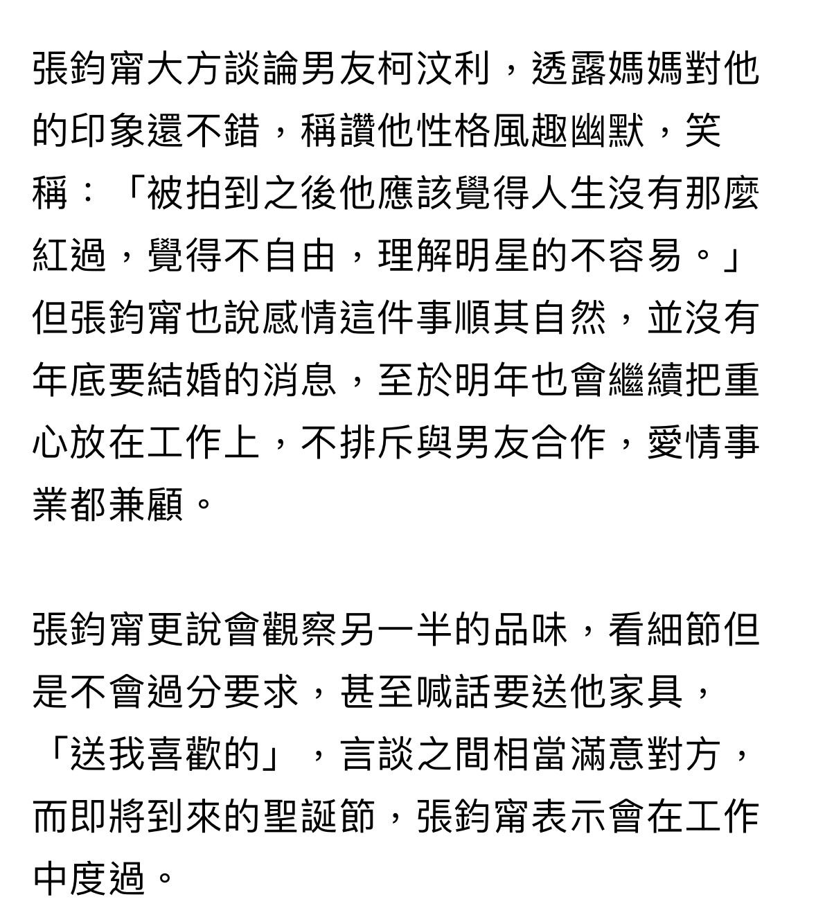 12月22日,张钧甯公开承认与柯汶利的恋情,并透露自己的母亲已经见过男友,并且她妈妈对柯汶利印象非常好。称赞他性格风趣幽默。这一消息引起了众多网友的关注和祝福。