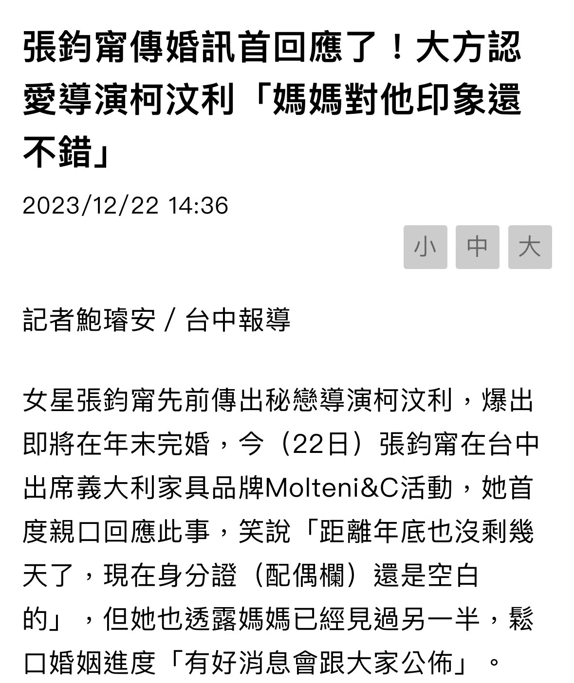 这一次,张钧甯不仅大方认爱,同时也回应结婚传闻,称:“距离年底没几天了、现在(配偶栏)还是空白的”,否认年底结婚的说法,同时表示:有好消息会跟大家分享。