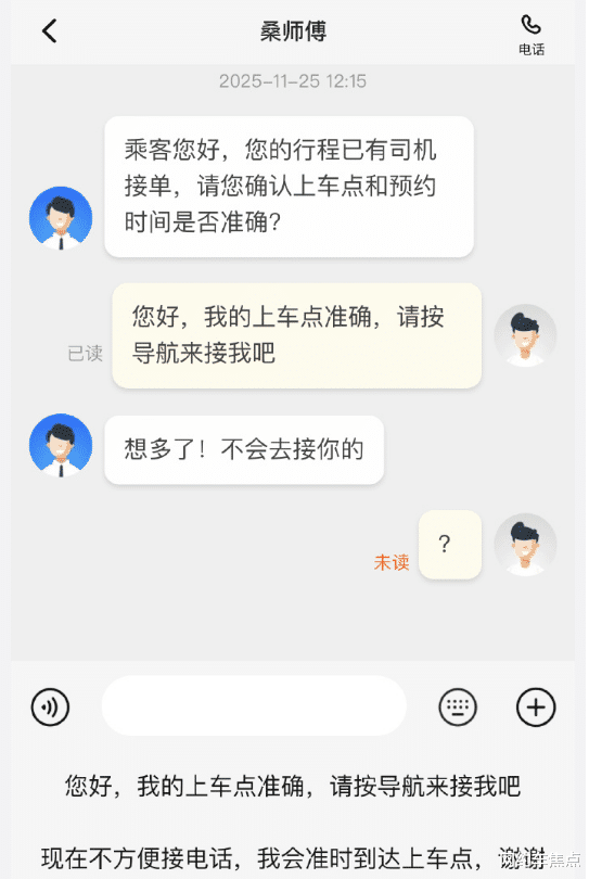手机上显示订单已匹配,司机距离正一点点缩短,但却突然收到司机的信息 ——“这个单我接不了”“我不会去接你的”“麻烦你取消下订单”。