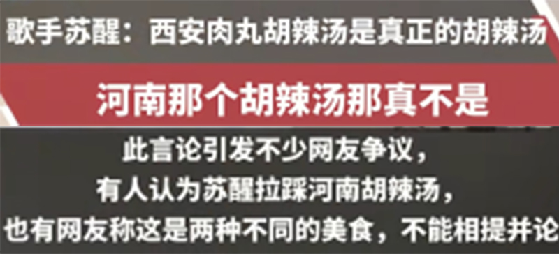 据悉苏醒在西安演唱会上说:“西安的肉丸胡辣汤是真正的胡辣汤,河南那个胡辣汤那真不是。”