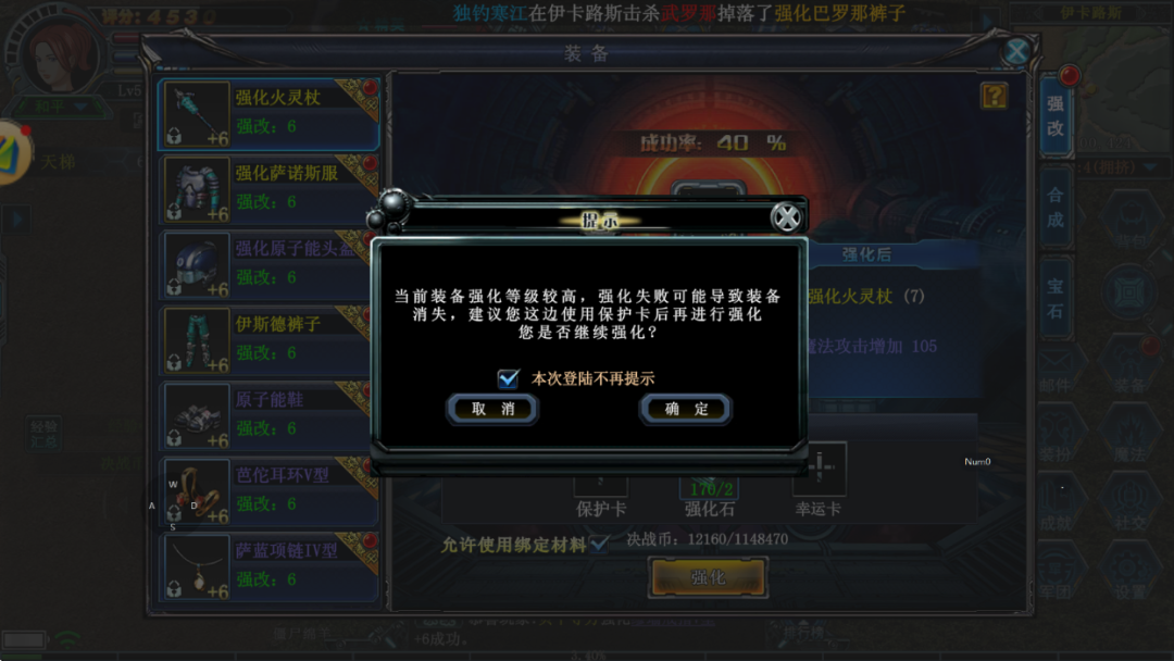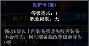 在使用保护卡的同时,配合幸运卡或强改卷轴提高装备强化成功率。
