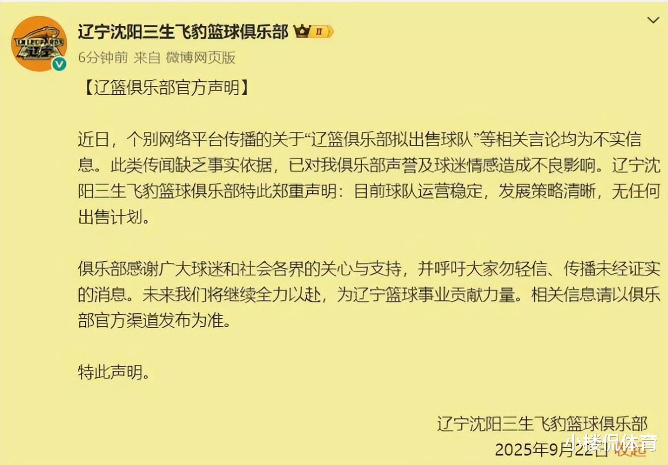 北京时间9月22日,辽宁沈阳三生飞豹篮球俱乐部通过社交平台,发布官方声明。声明指出,近日,个别网络平台传播的关于“辽宁俱乐部拟出售球队”等相关言论均为不实消息。声明指出,此类传闻缺乏事实依据,已对俱乐部声誉及球迷情感造成不良影响。对此,辽宁沈阳三生飞豹篮球俱乐部郑重声明: