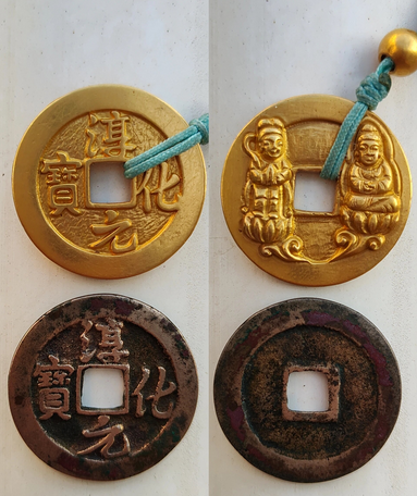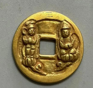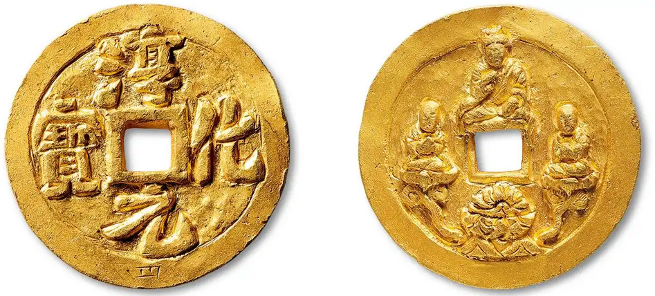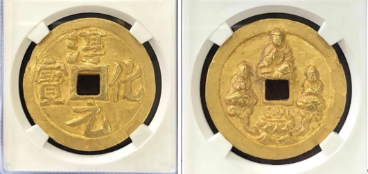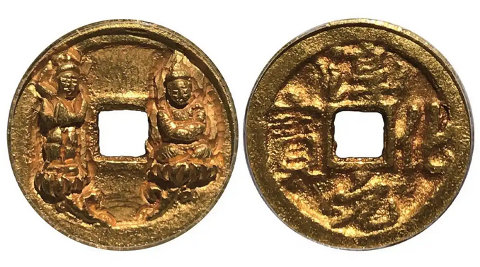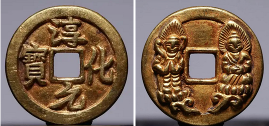 金淳化元宝最具特色的,便是其钱背的佛像图案。每一枚钱币的背面,都铸有两尊神态逼真的佛像,右侧为结跏趺坐于八叶莲花宝座之上的坐佛,左手持莲花,背后有佛光屏,祥云环绕;左侧为双手合十、身体微侧站立在莲花瓣座上的立像,身披帔帛,神态虔诚。关于这两尊佛像的身份,历来众说纷纭,有学者认为是观音菩萨与善财童子,也有专家考证为大日如来与普贤菩萨,更有观点认为,立像是宋太宗以供养人身份的自画像,整体构图呈现出“帝王礼佛”的场景,暗藏着宋太宗巩固政权、寻求心灵慰藉的复杂心境。无论何种解读,这两尊佛像都雕刻细腻、线条流畅,将宋代佛教造像的艺术精髓展现得淋漓尽致,也让金淳化元宝成为中国钱币史上唯一一枚铸有佛像的金质御书钱,极具艺术价值。