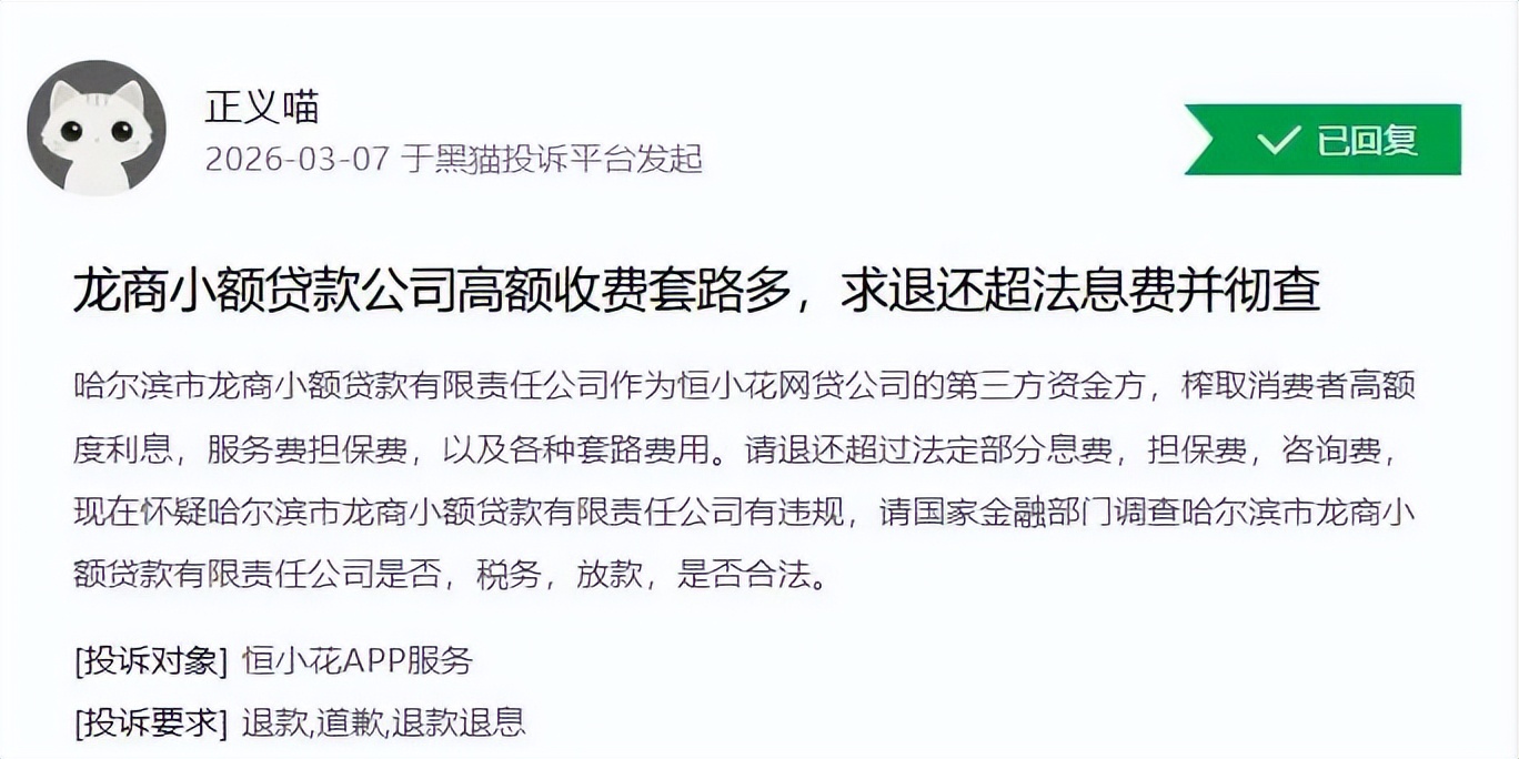 3月7日,一名消费者投诉称,通过恒小花借款,资方是哈尔滨市龙商小额贷款有限责任公司,除了收取高额利息外,还被收取服务费、担保费以及各种套路费用,要求退还超过法定部分的息费、担保费、咨询费等。