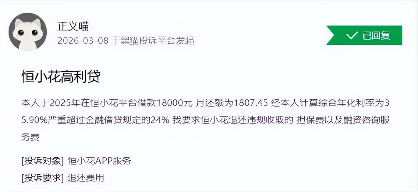 在黑猫投诉平台,3月8日,一名消费者称,2025年,在恒小花平台借款18000元,月还款额为1807.45元,综合年化利率达35.90%,严重超过金融借贷规定的24%,要求恒小花退还违规收取的担保费以及融资咨询服务费。