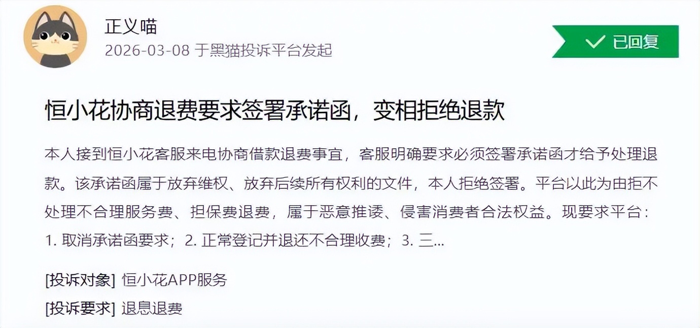 还有消费者反映,与恒小花电话协商退费事宜时,对方要求签署承诺函、放弃维权才肯退款。