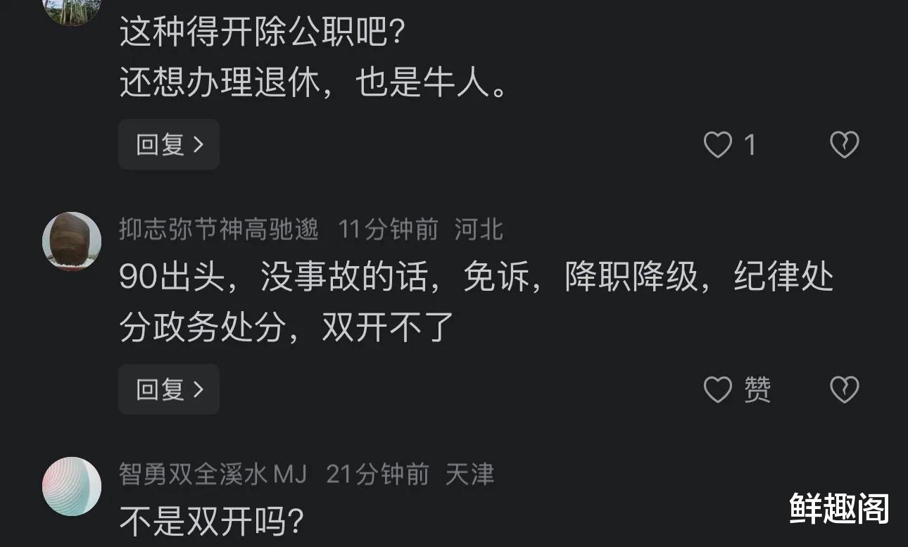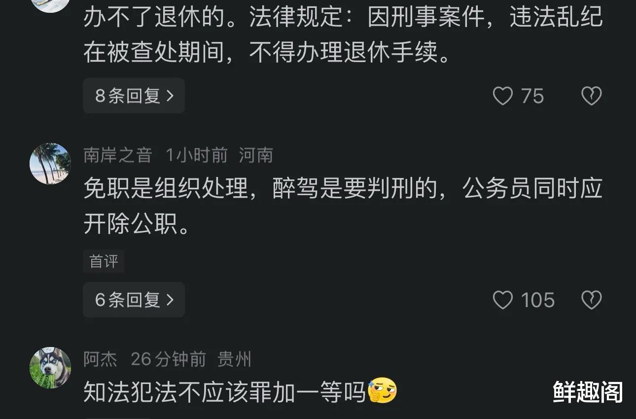 有网友表示,李某某如果涉嫌危险驾驶,严重情况下是要被拘留的;还有网友认为,李某某这是知法犯法,为什么能提前退休?不过也有网友认为,事情的细节还不清楚,酒驾也分很多种,希望后续有具体的通报。那么对于此事,各位怎么看呢?欢迎在评论区留言讨论。