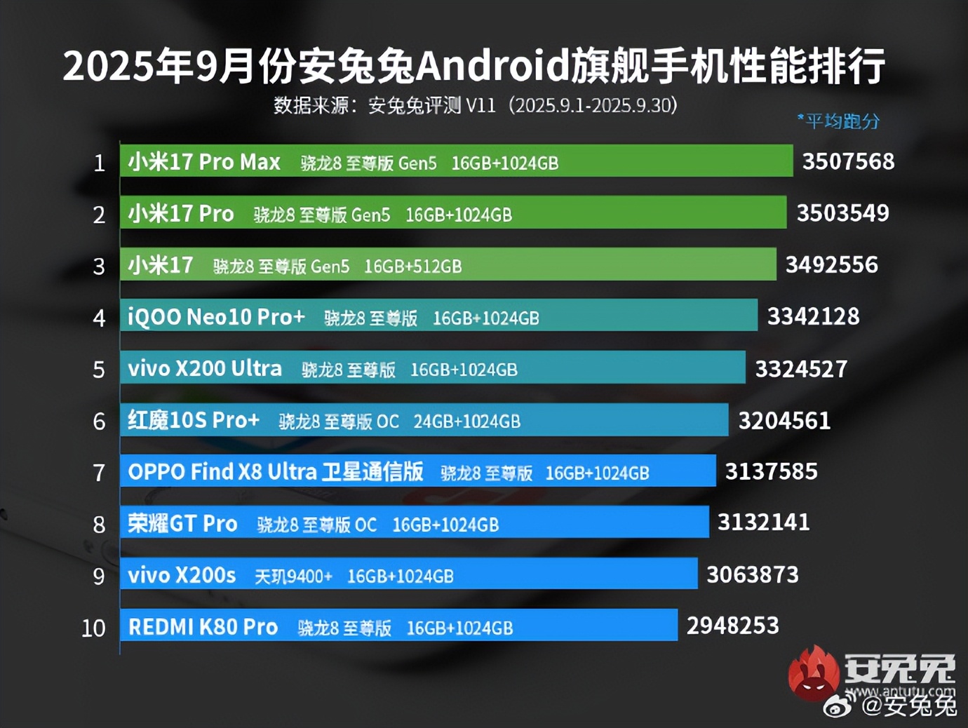 根据安兔兔最新的性能排行榜,小米17的CPU得分为 981,459 分。单看数字固然令人印象深刻,但仅比搭载去年骁龙8 Elite芯片的vivo X200 Ultra(得分959,329)高出约3%。