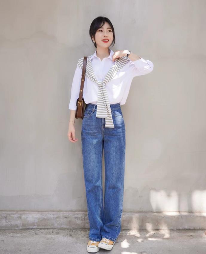 下身搭配一条牛仔阔腿长裤,这种版型的裤子,真的很藏肉显瘦,能轻松遮掩起身上的所有不足,像腿粗、腿型不够笔直的情况,都可以得到很好的改善。脚下选择一双白色运动鞋,很好与衬衫进行了色彩呼应,和谐又高级。▼