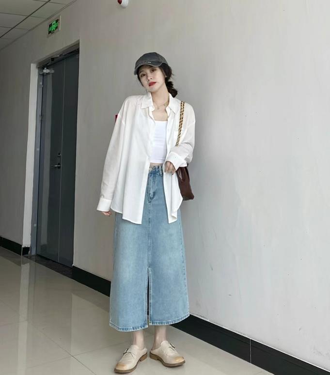 下身可以配牛仔裤,或者是这种牛仔半身长裙,直筒版型的裙身,超藏肉显瘦的,裙摆处开叉设计,也是蛮有小心机的,巧妙拉长腿部线条,这么穿青春减龄又不失高级感。▼