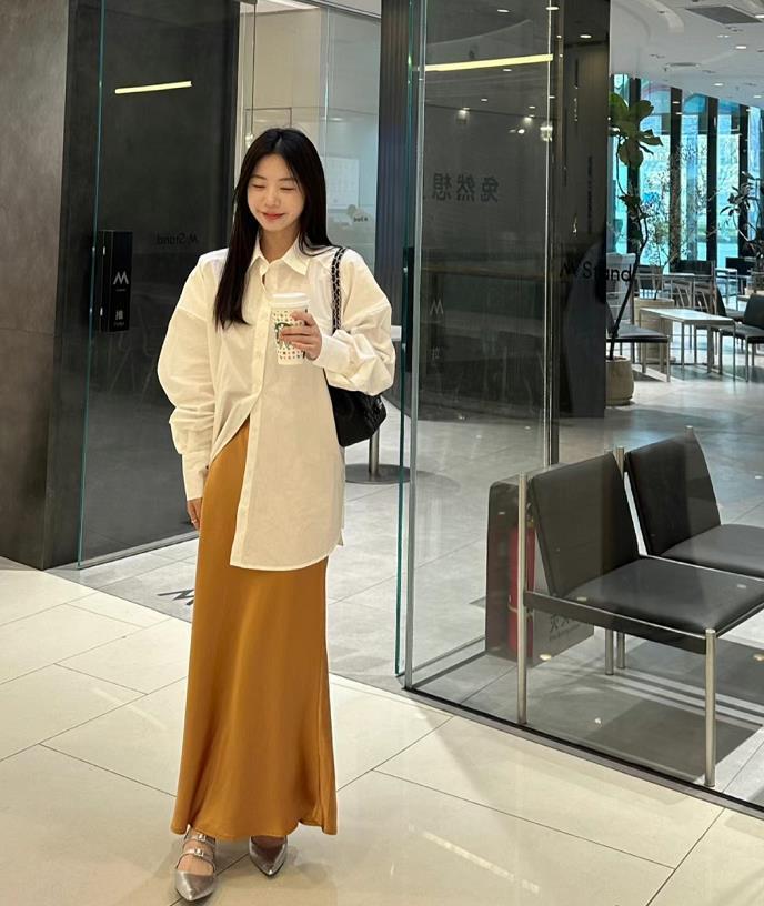 即使是配这种缎面半身长裙,也毫无违和感,一双银白色玛丽珍单鞋,优雅气质还不失女人味,喜欢这么穿的姐妹们,不妨借鉴一下吧。▼
