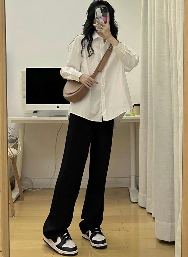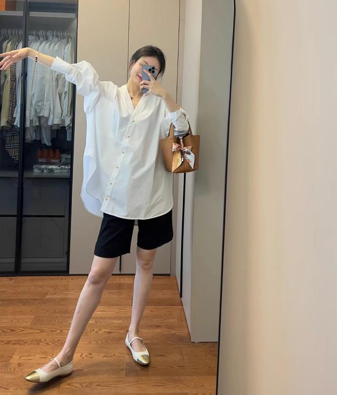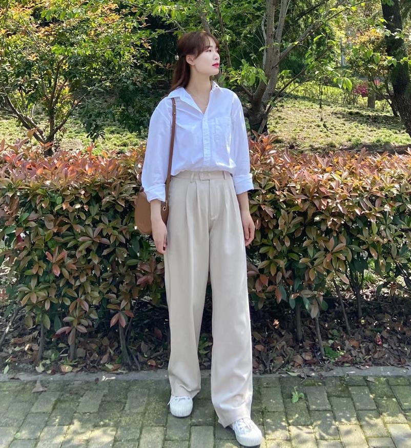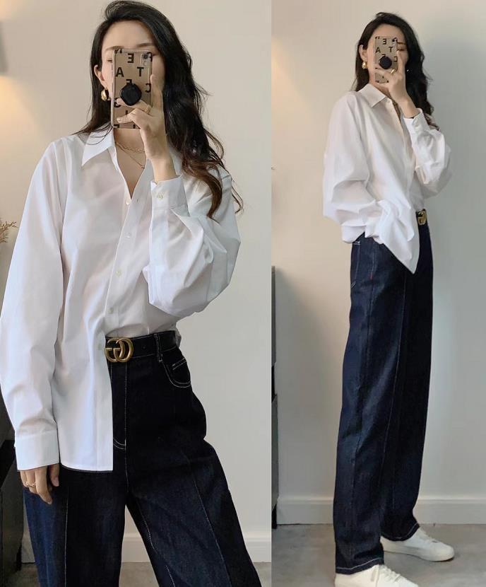 白衬衫真的是永不过时的存在啊~与一般修身版型的款式不同,这件白衬衫的版型是有些宽松的,穿起来正好能够隐藏起身上的缺点,例如腰粗、小肚腩等。
