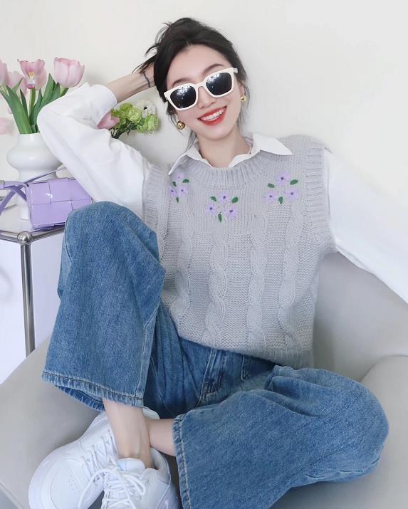 叠穿的快乐谁能懂啊?干净的白色衬衫,真的是超级简约和大方的,也是能打造出高级感的款式,比起单穿,叠穿会更时髦,像这位姐妹就配了一件浅灰色刺绣毛衣背心马甲,简单又日常好看。